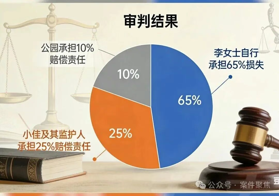 综上,法院判决李女士自行承担65%的损失,由小佳及其监护人承担25%的赔偿责任,由公园承担10%的赔偿责任。一审判决后,各方当事人均未上诉,判决已经生效。