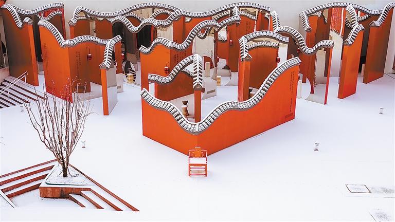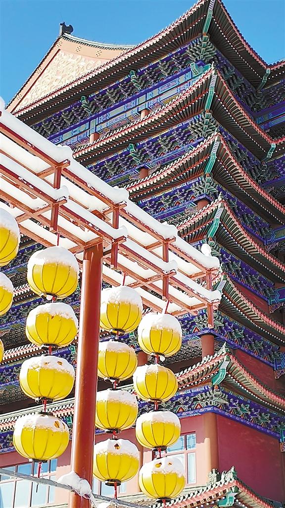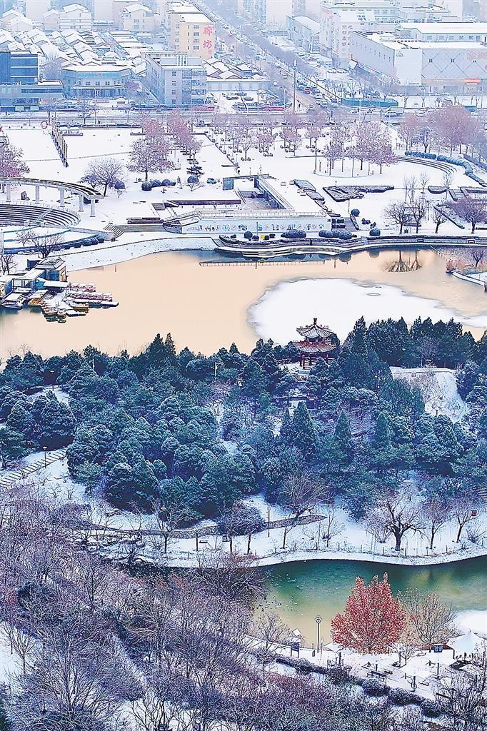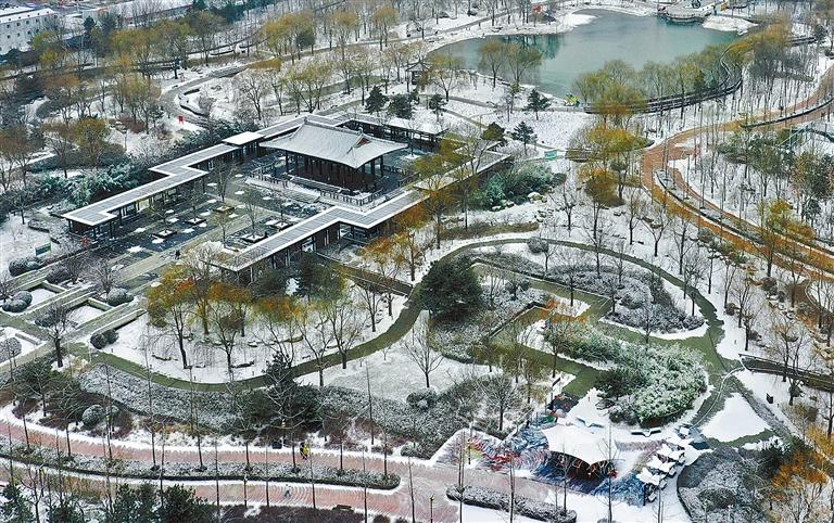 ◀初雪后的安次区瑞丰公园如一幅水墨画卷。